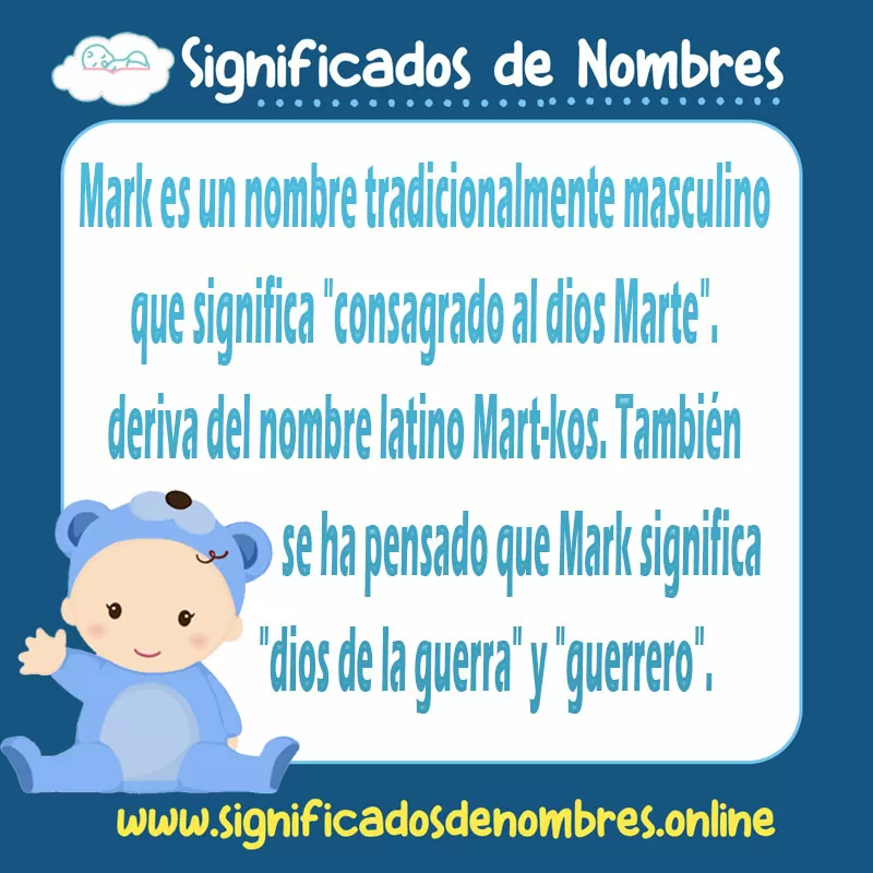 - Género: Mark es un nombre tradicionalmente masculino, pero se le puede dar a un niño de cualquier género.