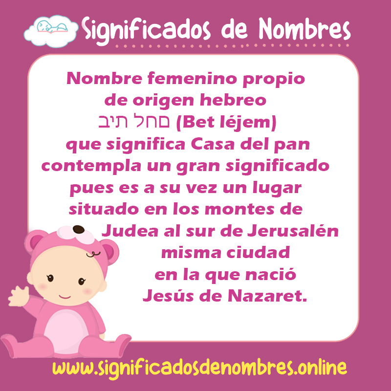 Se trata de un nombre femenino propio derivado de Betania de origen hebreo בית לחם (Bet léjem), que significa Casa del pan, este nombre tiene un gran significado religioso para musulmanes, cristianos y judíos pues es a su vez un lugar situado en los montes de Judea al sur de Jerusalén.