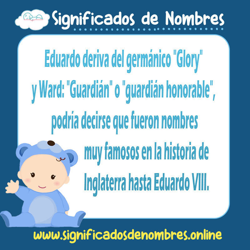 Con base en algunos estudios, creemos que Eduardo deriva del germánico «Glory» y Ward: «Guardián» o «guardián honorable», podría decirse que fueron nombres muy famosos en la historia de Inglaterra desde el mártir del siglo X San Eduardo hasta Eduardo VIII.